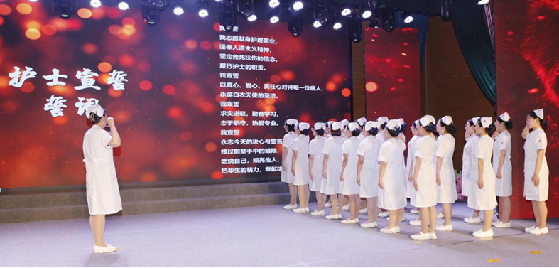 授帽仪式上,2020级规培护士按照顺序,迈着整齐而坚定的步伐走上舞台,躬身下蹲,微微低头,虔诚谦虚地接受前辈们手上的燕尾帽。“我志愿献身护理事业,谨奉人道主义精神,坚定救死扶伤的信念……”授帽护士在护理部主任郭朝利的带领下,举起右拳庄严宣誓,在铮铮誓言中表达了自己不辱白衣天使神圣使命的决心。护士代表呼吸与危重症医学科黄金丽发言,她清楚地知道自己肩负的责任和使命,表示会珍惜岗位,不忘初心,砥砺前行,为医院美好的未来奉献青春和力量。