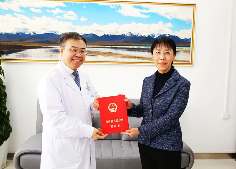 赵红严为王锡山颁发中国医学科学院肿瘤医院山西医院(山西省肿瘤医院)总院长聘书。