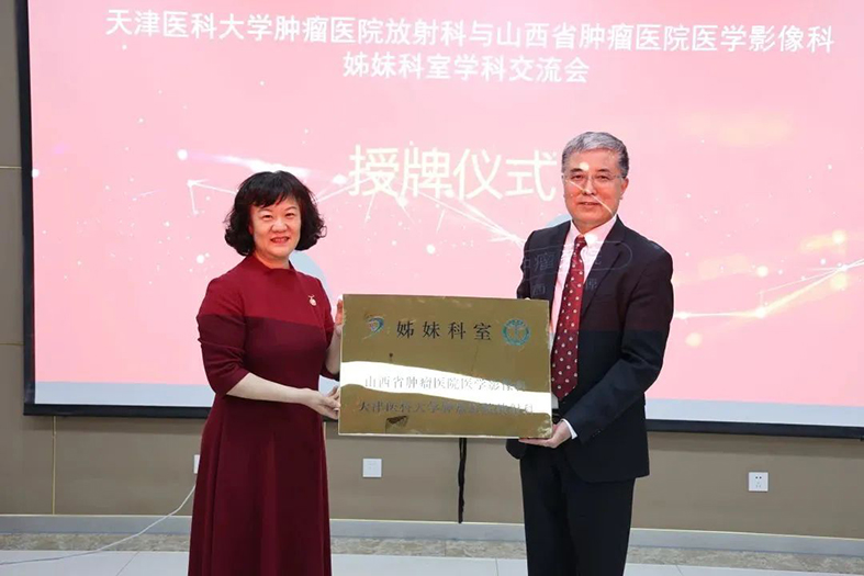 ▲天津医科大学肿瘤医院放射科主任叶兆祥与山西省肿瘤医院副院长杨晓棠向对方科室授牌。