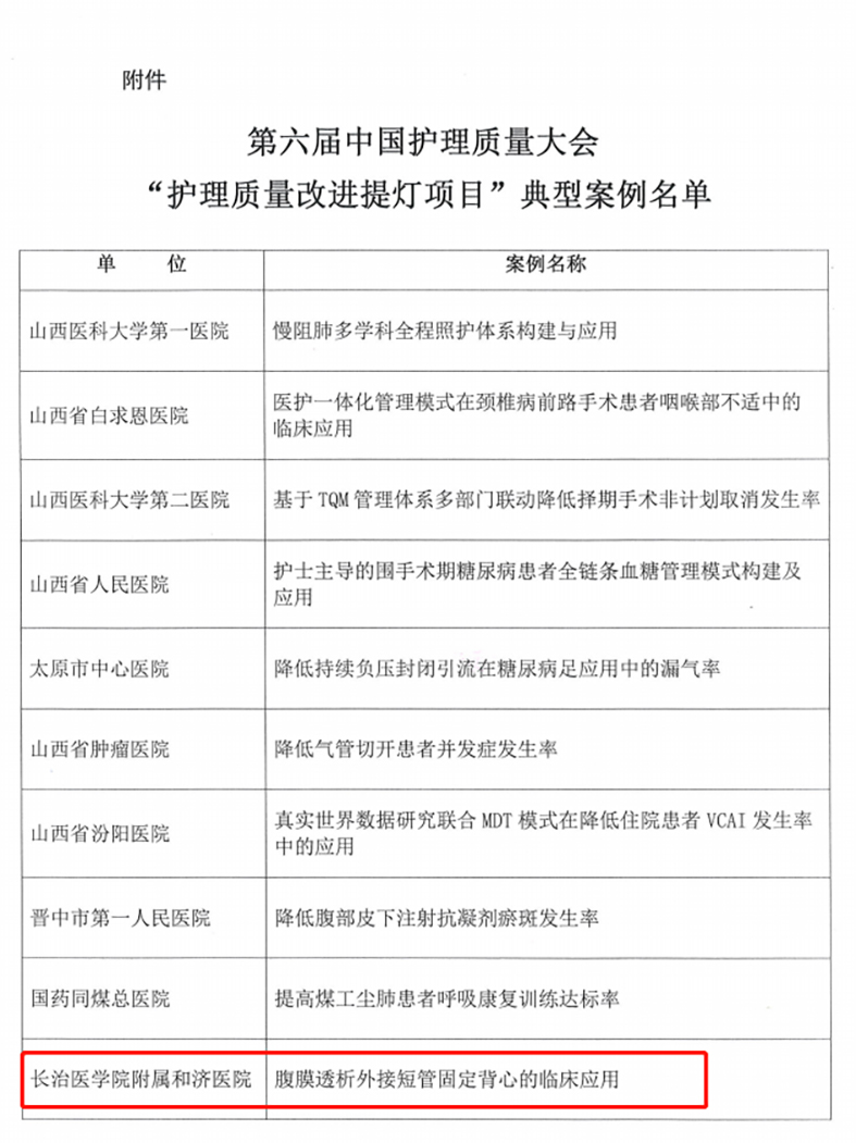 近日,由山西省医院协会理事单位——长治医学院附属和济医院护理部组织,肾病学科护理团队参选的《腹膜透析外接短管固定背心的临床应用》荣获第六届中国护理质量大会“护理质量改进提灯项目”典型案例。