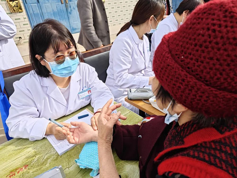 义诊现场,医护人员为前来参与活动的村民提供免费测量血压、血糖、耳穴疗法、中医把脉问诊等服务,耐心地回答问题,积极宣传中医调理和预防保健养生知识。