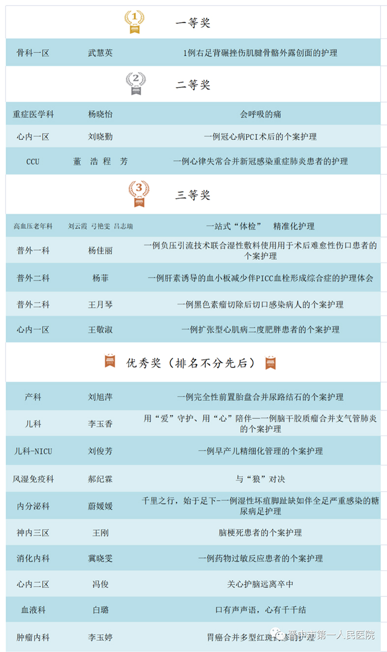 评委们根据参赛案例的典型性、科学性、创新性、现场表现力等进行综合评分,最终骨科一区武慧英获得一等奖;重症医学科杨晓怡、心内一区刘晓勤、CCU董浩和程芳获得二等奖;高血压/老年医学科刘云霞、弓艳雯、吕志瑞,普外一科杨佳丽,普外二科杨菲,普外二科王月琴,心内一区王敬淑获得三等奖。