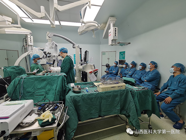 学术活动第一日,由山西医科大学第一医院刘晓东主任医师、郑安潮主任医师、李晋虎副主任医师和柏瑞主治医师组成的神经外科脊柱脊髓团队为来自全省各地的学员进行神经脊柱外科手术演示,包括2台显微镜辅助前路颈椎间盘减压融合术(ACDF)、1台显微镜辅助微创通道双节段腰椎间盘切除术、1台显微镜辅助椎板间入路脊髓栓系松解术。