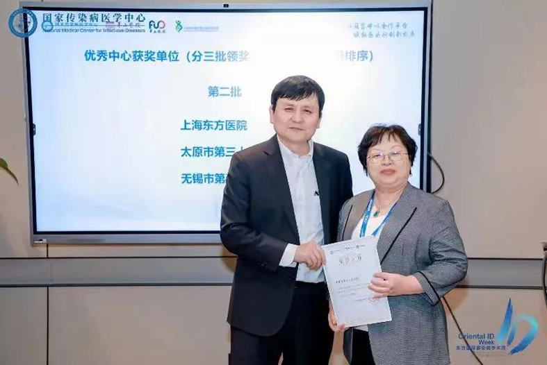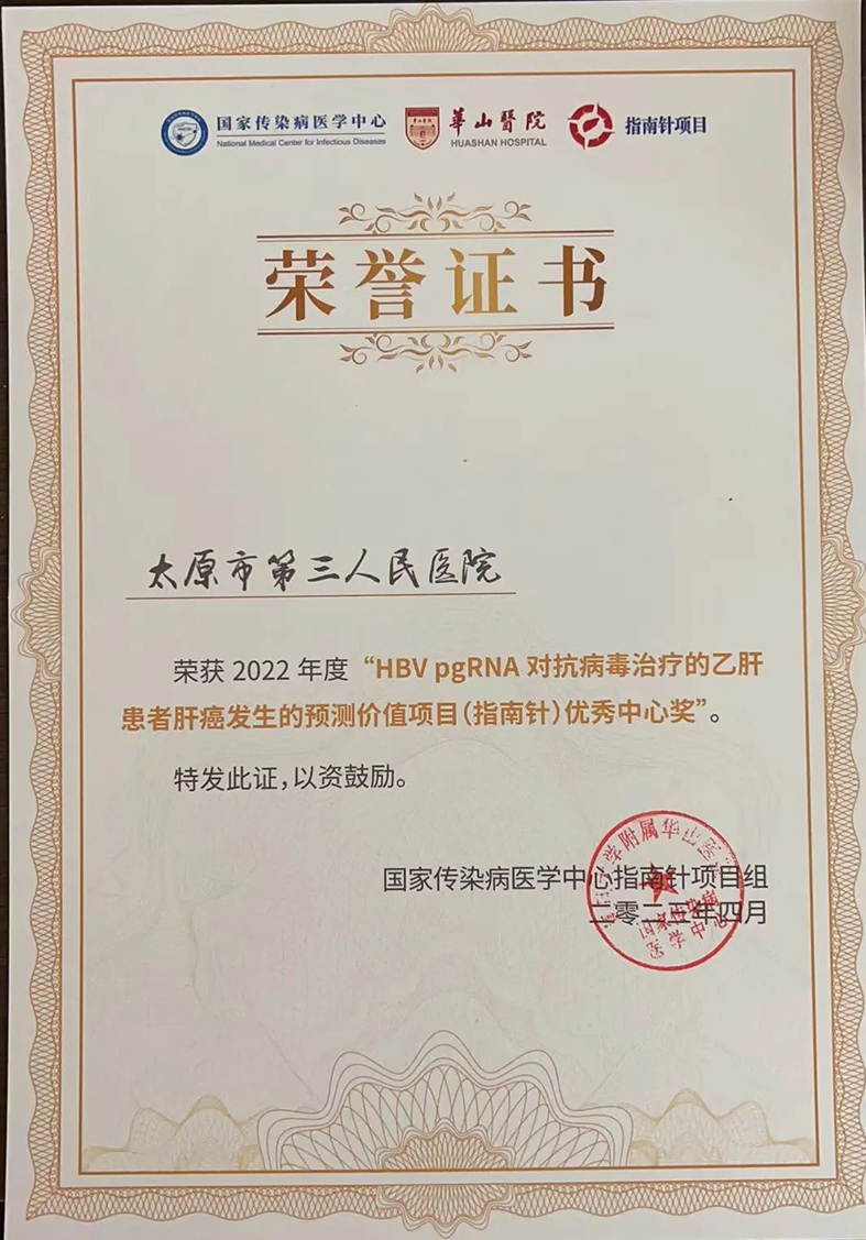 近日,在上海召开的国家传染病医学中心第一届感染合作论坛暨首届东方国际感染病学术周上,张文宏教授主持“HBV pgRNA 对抗病毒治疗的乙肝患者肝癌发生的预测价值项目(指南针)”中期总结会,对山西省医院协会理事单位——太原市第三人民医院的工作给予充分肯定,并为该院颁发2022年度优秀中心奖荣誉证书。