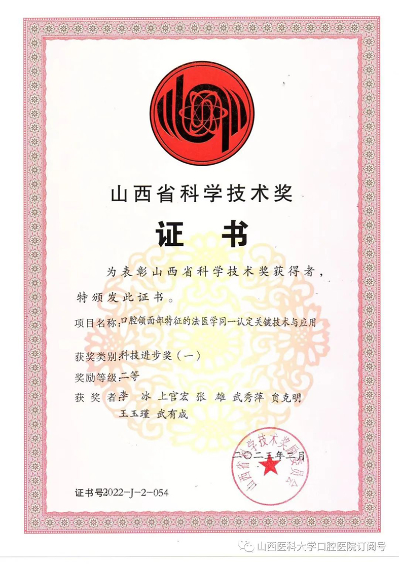 近日,2022年度山西省科学技术奖揭晓,山西省医院协会理事单位——山西医科大学口腔医院李冰教授团队申报的“口腔颌面部特征的法医学同一认定关键技术与应用”项目喜获山西省科技进步奖二等奖。