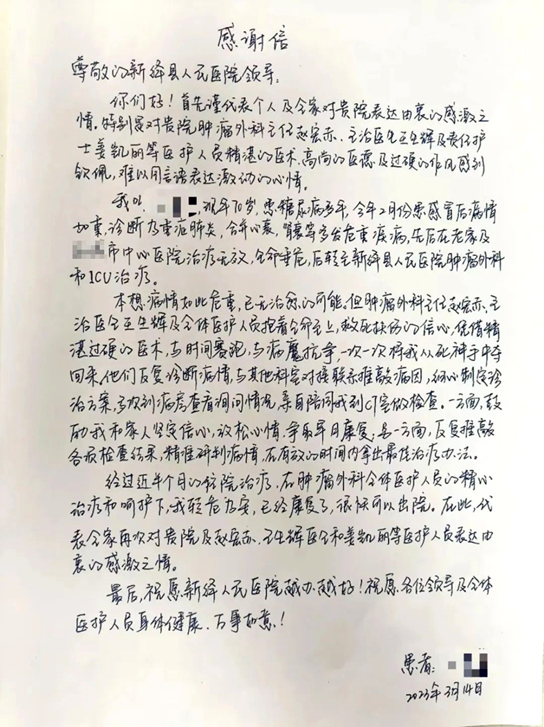“感谢肿瘤外科全体医护人员,遇到这样优秀的团队,是我们患者的幸运。在他们的治疗下,我的病症很快好转,周到贴心的服务,更让我心里很暖和……”