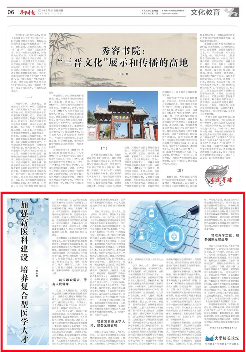 党的二十大报告指出,“人民健康是民族昌盛和国家强盛的重要标志”“培养造就大批德才兼备的高素质人才,是国家和民族长远发展大计”。我们要为党育人、为国育才,为人民群众培养“下得去、留得住、用得上、够得着”的医学人才。