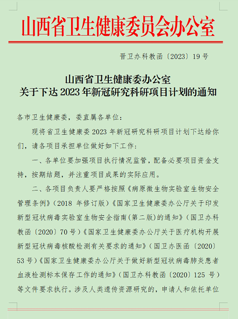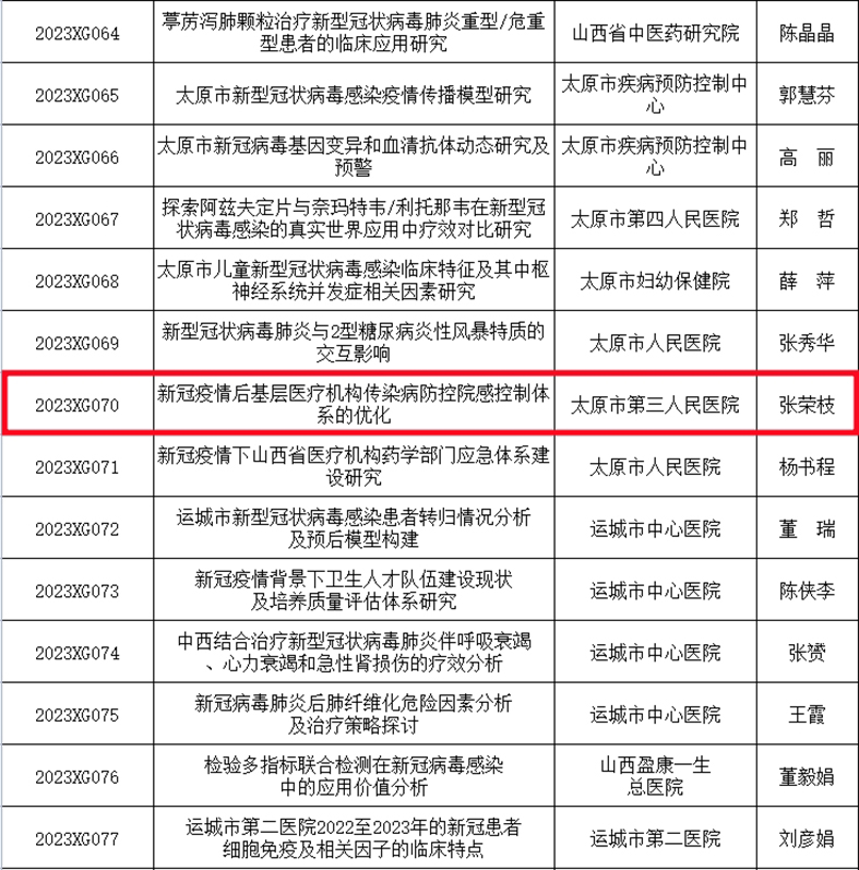 日前,山西省卫生健康委办公室下达2023年新冠研究科研项目计划,山西省医院协会理事单位——太原市第三人民医院申报的《新冠疫情后基层医疗机构传染病防控院感控制体系的优化》获批。