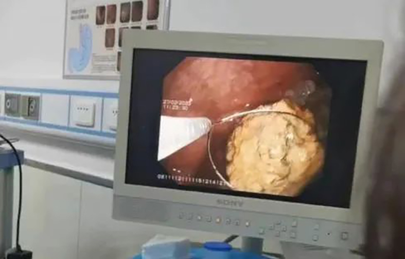 患者,男,56岁,因胃部不适且逐渐加重于2月17日来院就诊。该院胃镜室行胃镜检查,发现一约4厘米x5厘米大小胃结石、胃糜烂。