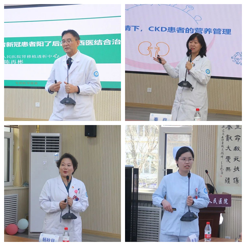 随后,肾内科名誉主任陈再彬主任医师,血液净化中心、肾内科负责人秦彦主任医师,血液净化中心康彦主治医师及血液净化中心吴丹丹主管护师围绕世界肾脏日主题分别开展了“血透患者新冠患者阳了后的中西医结合治疗知识”“新冠病毒疫情下,CKD患者的营养管理”“血液透析患者的高钾饮食”“透析应知应会”等讲座。专家们用通俗易懂的语言及专业的医学知识耐心解答肾友提出的问题,并叮嘱他们改变不良的生活习惯,做到早发现、早预防、早治疗。