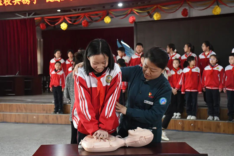 耳鼻喉科负责人、主治医师李晋详细讲解耳朵的解剖结构、日常生活中如何护耳等知识,加强了学生的爱耳意识和听力防护相关知识。胸神泌尿外科主治医师王伟讲解了校园内可能发生的外伤、扭伤等意外事件的急救要点和包扎、处理措施。急诊科副护士长王玢为大家进行心肺复苏术操作培训,“确认现场安全,判断意识、呼吸、脉搏,胸外按压,打开气道、人工呼吸……”在医护人员的专业指导下,老师和学生们纷纷上前实践操作,一边练习,一边询问,学习氛围浓厚。(张雷霞)