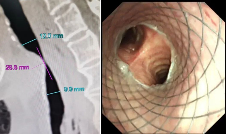 ▲左图为患者术前气管CT,右图为术后气管镜下的气管支架影像。