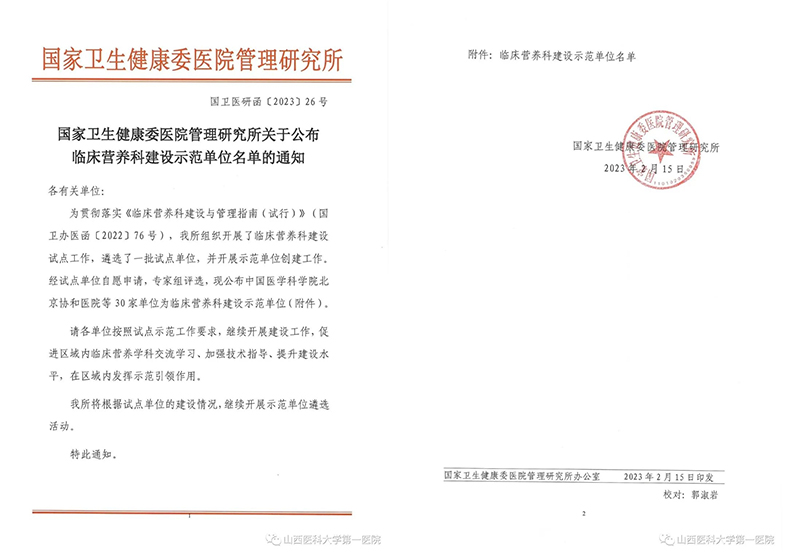 日前,国家卫生健康委医院管理研究所公布临床营养科建设示范单位名单,山西医科大学第一医院榜上有名。经自愿申请、专家组评选,此次共30家单位入选。
