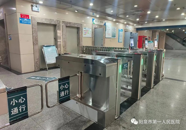 经过多方考察论证,阳泉市第一人民医院在内、外科住院楼一层大厅分别安装四组数字化人脸识别闸机,其中一组为加长防撞摆闸,作为病床、轮椅及特殊通道,其余三组为标准款防撞摆闸,作为患者、陪护(限2人)、探视、医院工作人员通道。