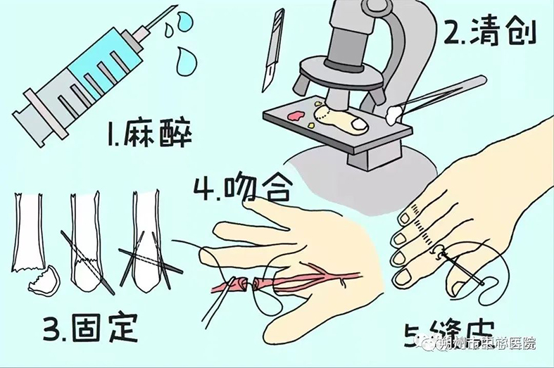 一是及时止血:大部分活动性出血,用纱布或干净的布按压伤口5到10分钟就能止住,若伤口大且出血不止,这时不要惊慌,这是因为手部血管丰富,外伤后出血快又多,最简单的止血法方法就是用橡皮圈绑紧手指根部,然要抬高,注意每隔20到30分钟,必须将橡皮圈放松几分钟,否则,以免肢体缺血性挛缩和坏死。放松止血带时应在受伤部位加压,以减少出血。