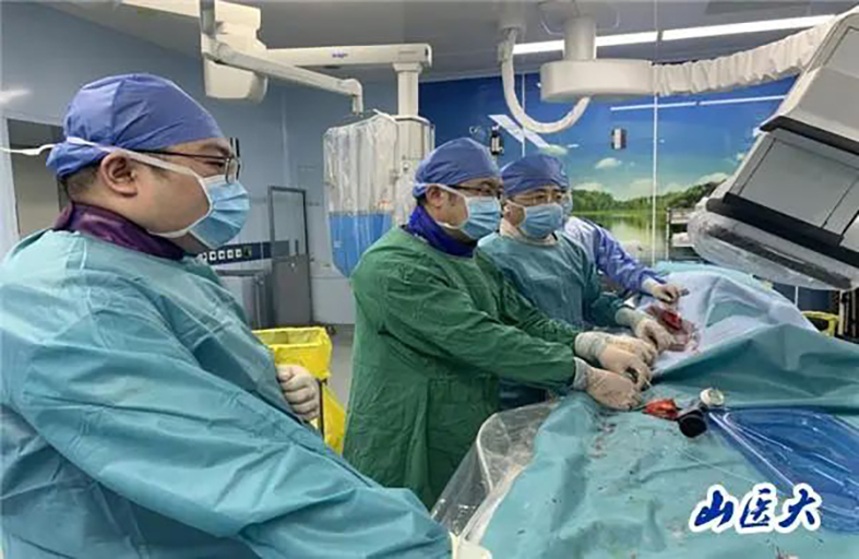 该患者为男性,63岁,有近50年吸烟史,平时要走路去干农活。近半年,走路过程中出现小腿憋胀无力、右足发凉,需要休息一会儿才能走的情况。近一个月,愈发严重,稍走不到50米就不得不休息,非常影响正常生活,特别是晚上睡觉也受影响。山西医科大学第二医院诊断其患右下肢动脉硬化闭塞症,已经达到Rutherford分期4期,静息痛明显,影响睡眠,足趾颜色暗红,濒临缺血坏死。进一步检查发现,患者右侧股浅动脉远段重度狭窄,且腘动脉近端闭塞,膝下动脉通过侧支代偿显影。