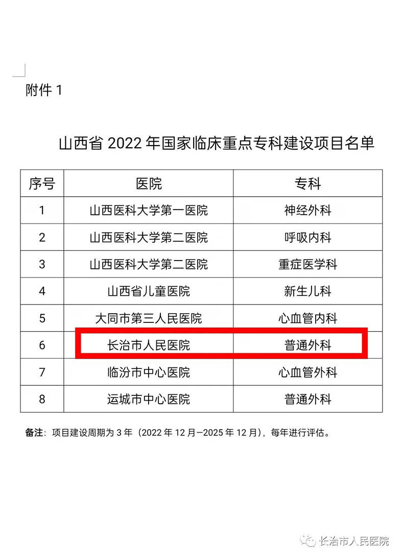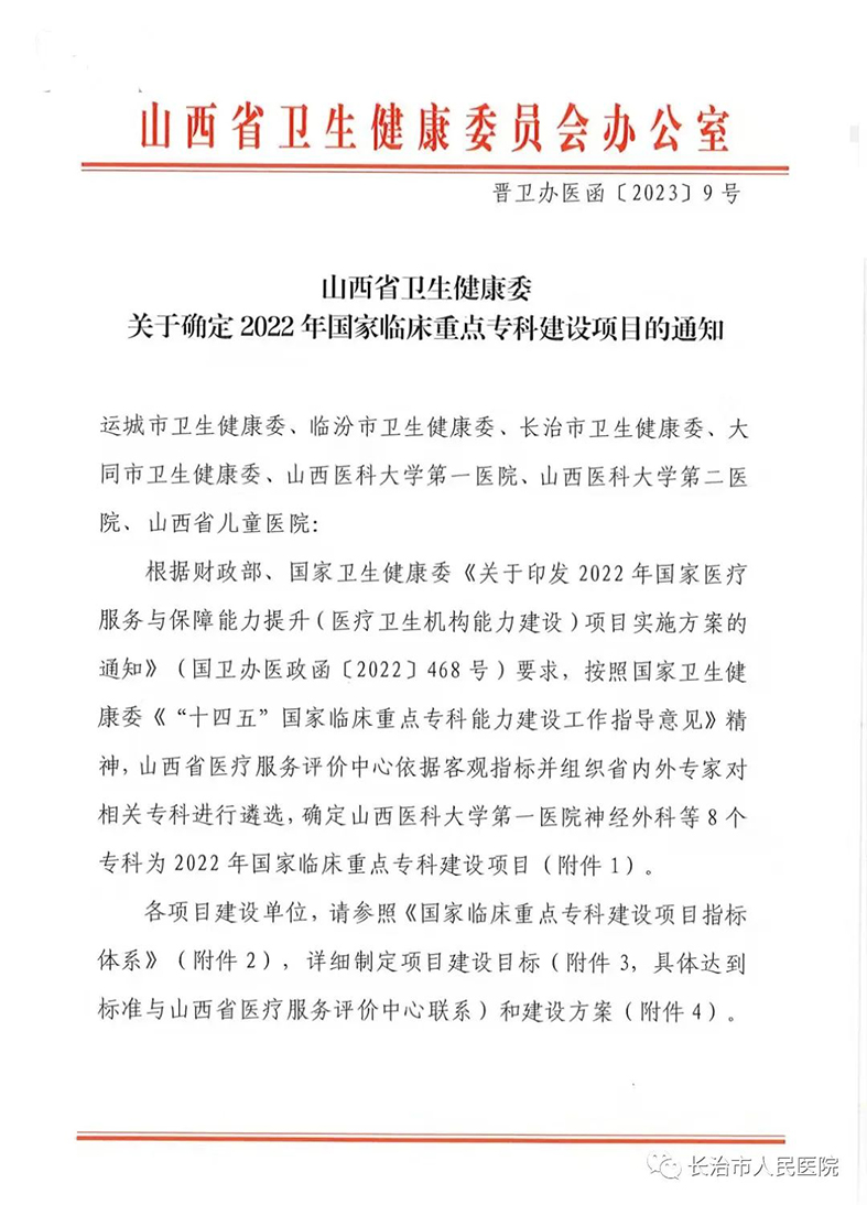 国家临床重点专科是国家卫生健康委根据医疗卫生发展需求,遴选产生的代表我国医疗技术和管理水平的优势临床专科,具有医疗服务能力强、技术质量水平高、科研教学能力强等特点,代表着全国先进医疗技术水平和服务能力。山西省卫生健康委根据国家卫生健康委《“十四五”国家临床重点专科能力建设工作指导意见》,遴选确定8个专科为2022年国家临床重点专科建设项目,分别为山西医科大学第一医院神经外科、山西医科大学第二医院呼吸内科、山西医科大学第二医院重症医学科、山西省儿童医院新生儿科、大同市第三人民医院心血管内科、长治市人民医院普通外科、临汾市中心医院心血管外科、运城市中心医院普通外科。