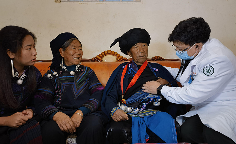 何安贵是螺髻山镇德育村10组村民,患有冠心病、心肌梗塞;其妻阿列么丁都67岁,患有高血压。陆军军医大学第二附属医院(新桥医院)心血管外科主任医师肖颖彬拿出听诊器,给何安贵快速做了检查,又取出血压计测量:“高压210了,您要特别注意啊!”