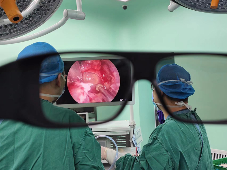 2月8日,手术如期展开。术中,医生利用内镜上的两个摄像头形成三维图像,完整呈现术野的长度、宽度和深度,获得立体感。此外,还使用了多普勒等先进设备。在大家的共同努力下,手术非常成功,术中完全切除垂体瘤组织。目前患者恢复良好,视物模糊等症状明显好转。