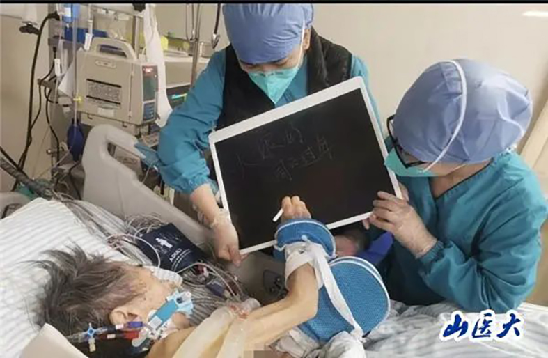 在新冠疫情的阴霾还未散去之时,我们迎来了2023年的春节。山西医科大学第二医院急诊科救治的这位老奶奶身患重症肺炎、糖尿病,送到急诊科抢救室时,心率150-160次/分,血氧饱和度80%左右,痰粘稠量多,不容易咳出,意识嗜睡到浅昏迷,收住急诊ICU。医护人员对其予以气管插管,采取呼吸机辅助通气、抗感染治疗等一系列抢救措施。第三天,患者的意识恢复,在镇痛、浅镇静下与护士用笔进行交流,特意写下了“谢谢你们”。当班护士说:“患者用心写下的这四个字就是给我们医护人员最好的春节礼物。”