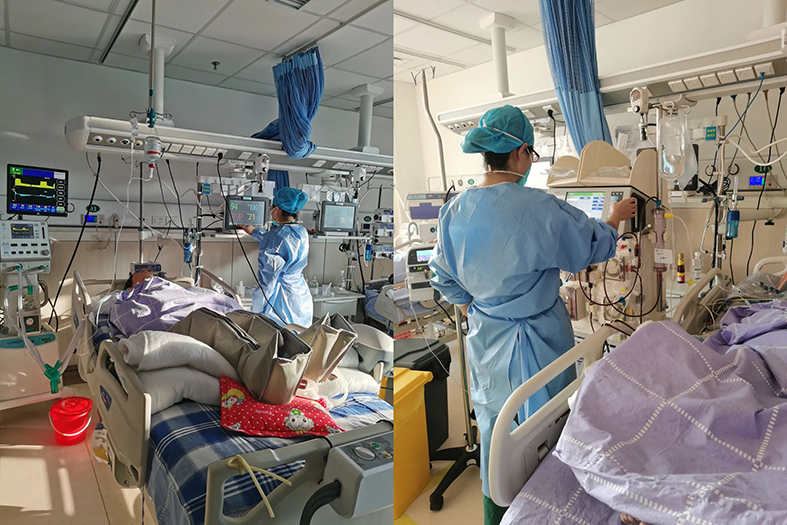 医生们不时来到病人床前,严密监测患者的体征状况,不允许有半点马虎,随时调整治疗方案,及时与患者家属沟通、解释病情。激增的患者和不间断抢救,对于大多没有康复的医护人员来说,还是有些吃力。但是看着病人从病情危重到稳定到出院,重症医学科医护内心的成就感满满。
