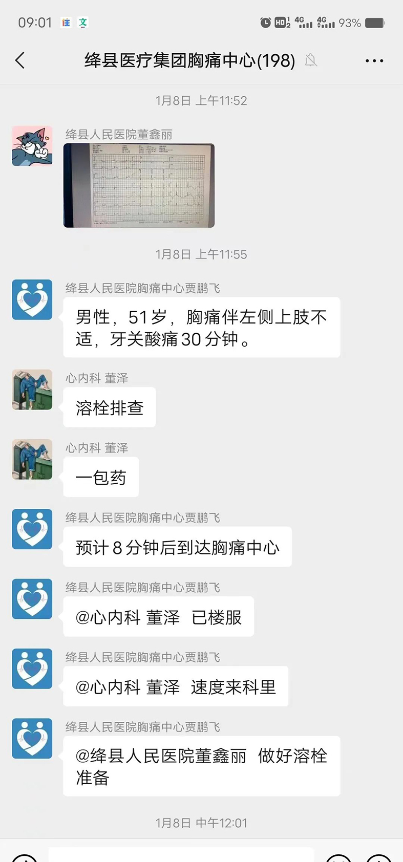 值班的董泽一看:ST段抬高ⅡⅢAVF,急性心机梗死 ,立即发出红色预警。他马上与值班医生贾医生联系,指导患者应用心梗一包药;联系胸痛中心,提前为患者办理住院手续,全程绿色通道;一键启动导管室。医务人员人员迅速到位,一场与死神抢夺生命的生死时速上演了。