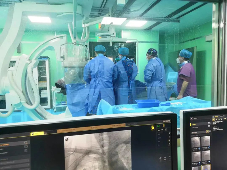 23:50,患者顺利送入导管室,开始冠脉造影。造影剂通过患者血管的一瞬间,医护人员震惊了:患者前降支中段100%闭塞、右冠状动脉中段100%闭塞!心脏的三根主要大动脉竟然堵了两根!病情十分危重,死亡率在95%以上。