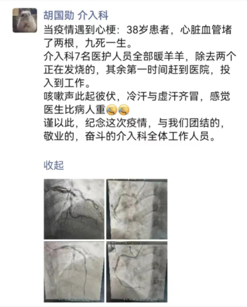 非常时期,新冠病毒感染在医护间迅速蔓延,介入科团队无一幸免。胡国勋、姚二冬技师、郝定平护士、马旭湛医师刚刚退烧,仍有咽痛、全身肌肉酸痛乏力症状。闫彬医师仍在发烧。曹进伟、李晓慧护士高烧不退……但是对于患者来说,“时间就是心肌,时间就是生命”。胡国勋带领医护人员强撑病体,迅速到岗,一场生死营救开始。