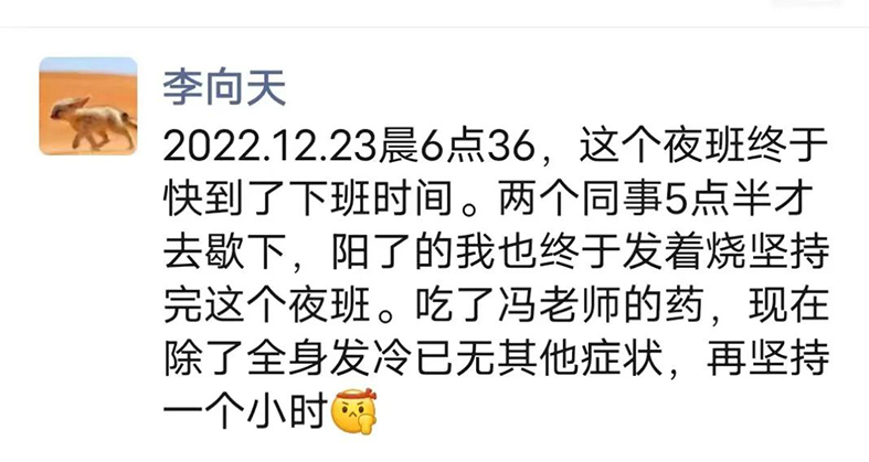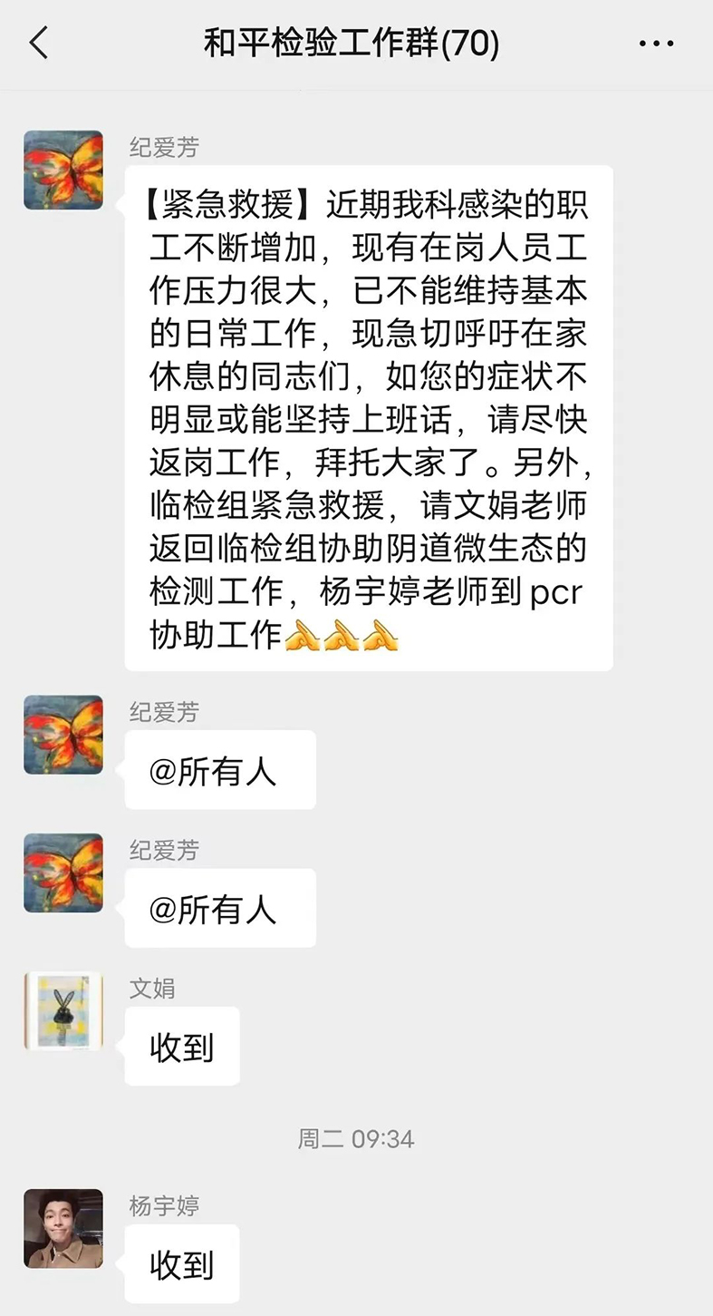 此时此刻,因感染在家发烧的科主任纪爱芳心急如焚,在检验科微信工作群发出“紧急求救信息”:近期我科感染的职工不断增加,现有在岗人员工作压力很大,已不能维持基本的日常工作,现急切呼吁在家休息的同志们,如您的症状不明显或能坚持上班的话,请尽快返岗工作,拜托大家了!