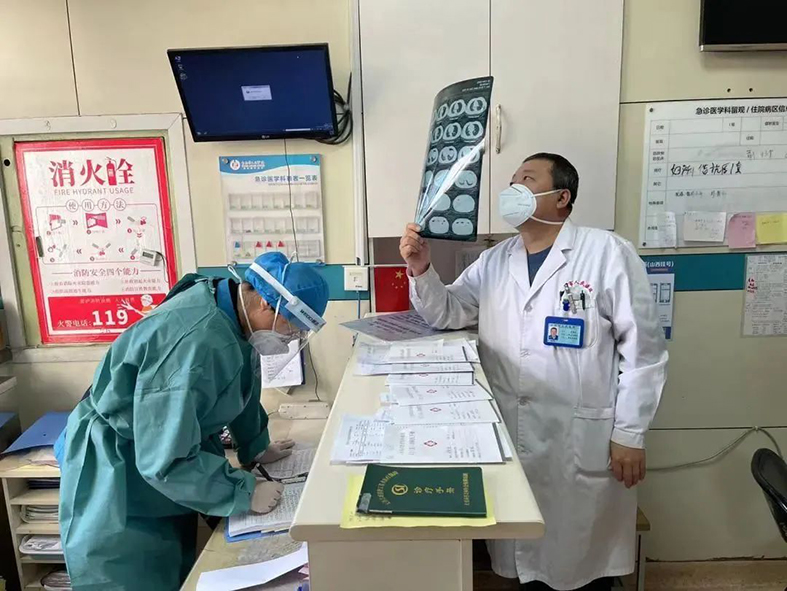 面对肆虐的新冠病毒,太原市人民医院急诊科全员进入24小时战备状态。急诊党支部书记、科主任张勇带头冲在第一线,坚持带病指挥。他说:“我知道大家很累很辛苦,但患者不能耽误,我们只有强打精神,抱团奋战,和病毒死扛到底就是胜利!”在他的带领下,广大党员冲锋在前,医护人员团结一致,不顾病毒感染带来的不适,一直坚守在患者身边。因为他们深知:作为医务人员,治病救人是义不容辞的责任;作为党员,更要有担当奉献精神,只有坚守阵地,才不辜负患者生命的重托和全院科室的支持。