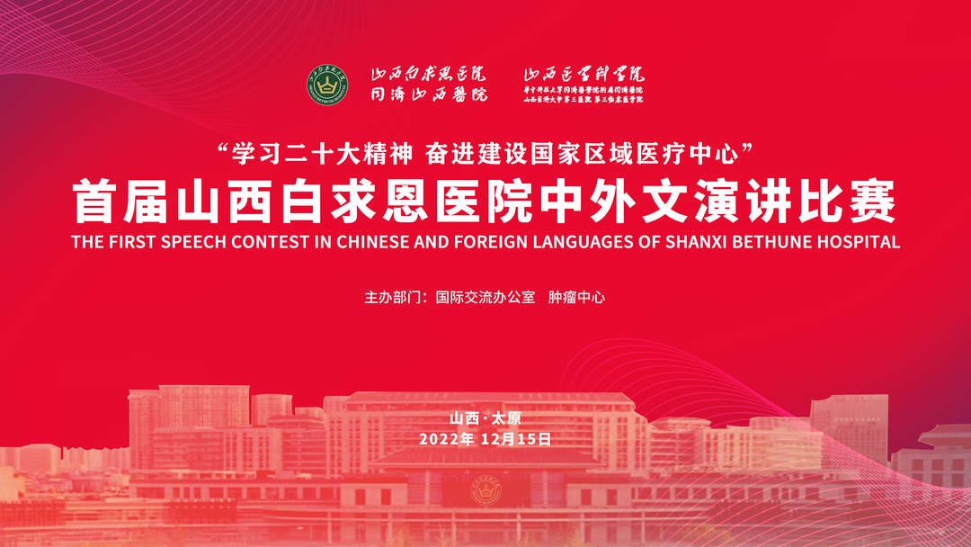 为深入学习贯彻二十大精神,全面提升医院国际交流合作能力和水平,打造山西乃至区域国际交流合作高地,12月15日,山西省医院协会理事单位——山西白求恩医院 同济山西医院国际交流办公室与肿瘤中心在肿瘤中心教研室联合举办以“学习二十大精神、奋进建设国家区域医疗中心新征程”为主题的首届山西白求恩医院中外文演讲比赛。