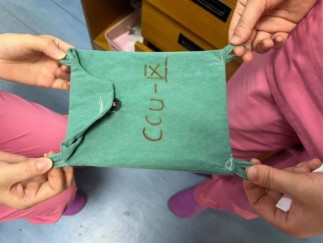 有了想法就要行动。贾菲立马召集护理团队成员开会,集思广益。加压包做成什么样子的?盐袋怎么放合适?用什么材质的布料最好?怎么做能够最大限度地降低成本等,从设计到材质再到成本控制,贾菲和团队成员都一一考虑到。经过3-4次的头脑风暴,“盐袋加压包”的形状跃然纸上:长方形,类似于口袋,能够装下2袋食用盐。形状有了,如何让加压包固定在患者的穿刺部位成了贾菲面临的又一难题。经过讨论,贾菲决定在加压包的四个角处各缝制一个圆环,一次性绷带穿过两个圆环绑在患者身上,“盐袋加压包”就牢牢地固定住了。固定问题解决了,接下来就是找布料进行制作。为节省成本,贾菲找到供应室护士长,决定采用淘汰下来的手术服做布料进行二次利用,既没有成本又方便消毒清洗,而且棉质的手术服透气亲肤,种种优点让贾菲当即开始找人制作。