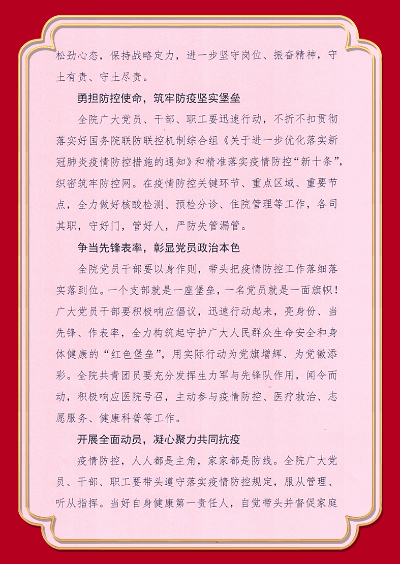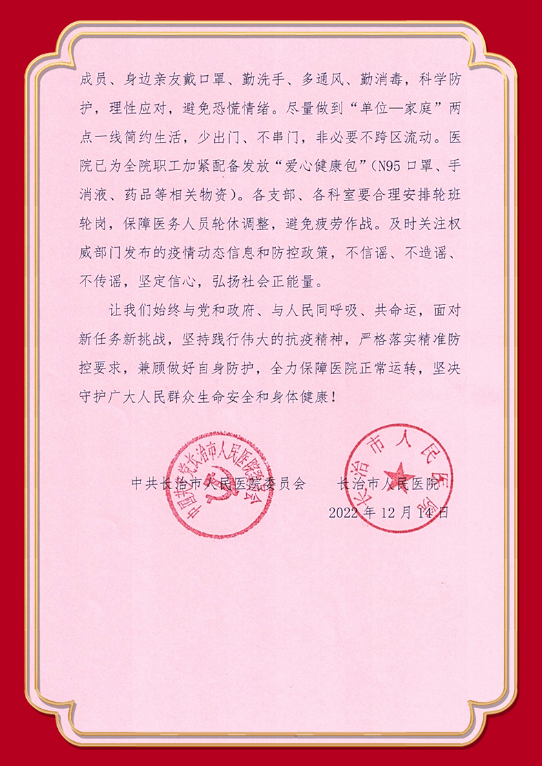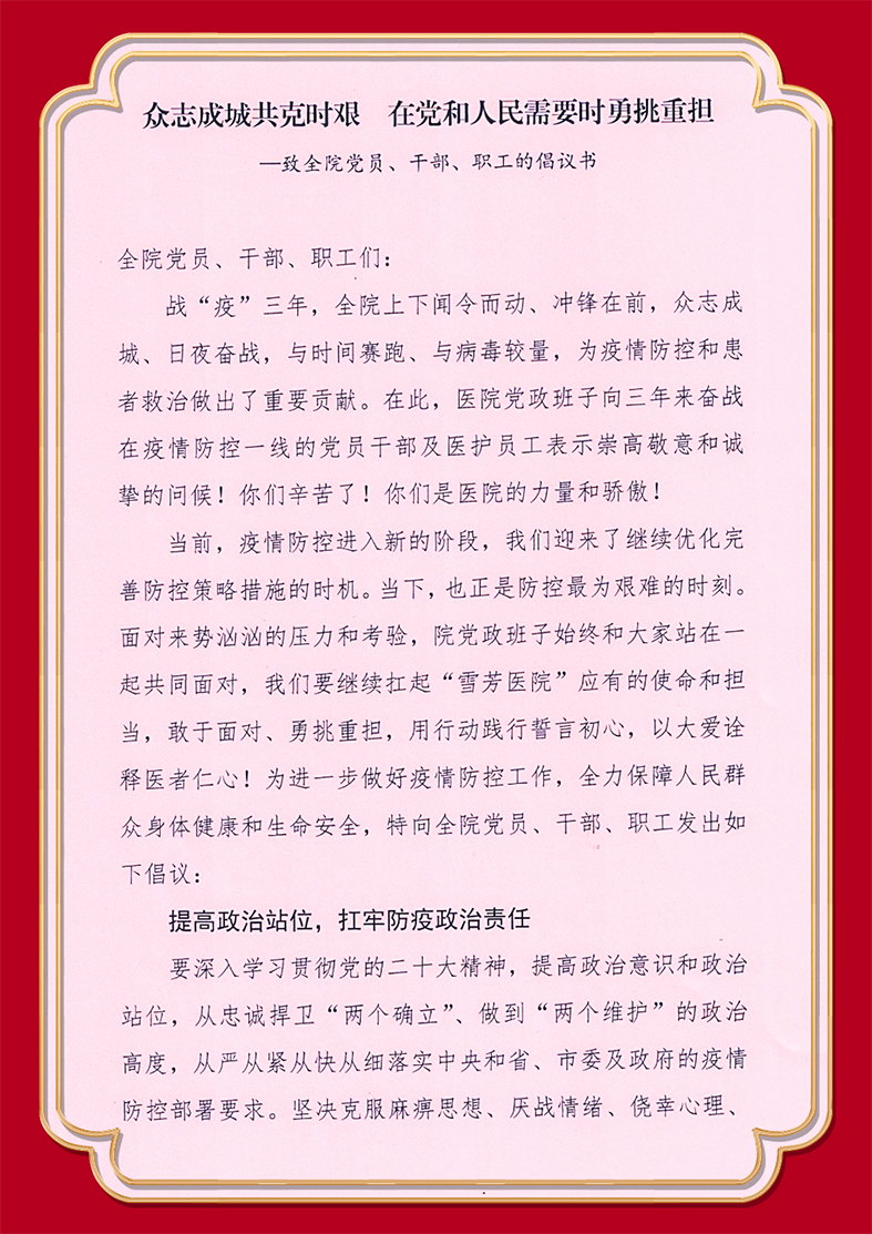 长治市人民医院致全院党员、干部、职工的倡议书:众志成城共克时艰 在党和人民需要时勇挑重担