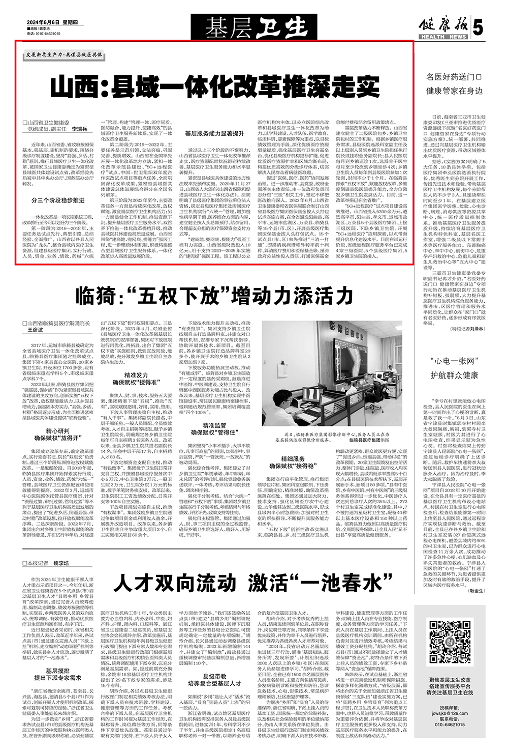 基层改革活力不断释放。山西省建立健全了二级医院包乡、乡镇卫生院包村的工作机制。根据乡镇医疗服务需求,县级医院选派科室副主任及以上级别人员到乡镇卫生院担任执行院长或挂职业务副院长;县人民医院每月到乡镇巡诊1次,选派骨干医生每月至少轮流到乡镇坐诊4次;乡镇卫生院人员每年到县级医院参加1次轮训,时间不少于1个月。在临猗县探索“五权下放”,赋能放权改革,多维度倒逼县级医院提升能力,全方位激发乡镇卫生院发展活力。目前,这一改革举措已在全省推广。
