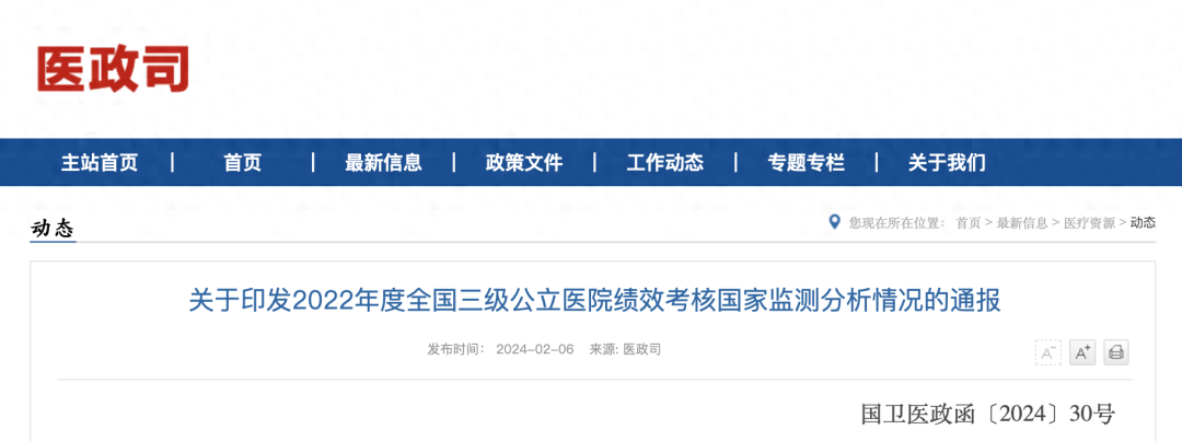 按照《国务院办公厅关于加强三级公立医院绩效考核工作的意见》(国办发〔2019〕4号)要求,我委联合相关部门连续推进三级公立医院绩效考核工作(以下简称绩效考核)。现将2022年度三级公立医院绩效考核国家监测分析情况通报如下: