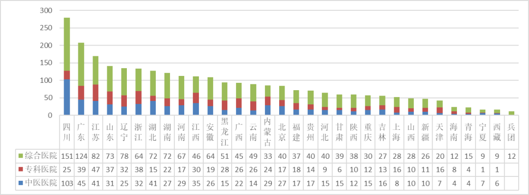 经各省级卫生健康行政部门和中医药主管部门审核确认,全国共2817家三级公立医院参加2022年度绩效考核,其中,西医类医院2112家(综合医院1521家,专科医院591家),中医类医院705家(见图1)。与2021年相比,新增考核医院128家,因合并、降级、撤销等原因退出考核的医院17家。