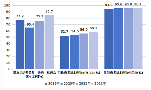 二是用药合理性水平进一步提高。抗菌药物临床应用合理性增强。抗菌药物使用强度持续优于40DDDs的国家要求(33.8DDDs),且仍呈下降趋势(见图3),抗菌药物使用强度符合规定要求的医院比例持续升高。基本药物使用占比进一步增加。2022年全国三级公立医院门诊患者基本药物处方使用占比(44.9%)较2021年提升2.6个百分点,住院患者基本药物使用占比保持稳定;国家基本药物配备使用金额占比(28.9%)较2021年提升0.7个百分点。采购并使用国家组织药品集中采购中标药品的积极性逐步提高。2022年全国三级公立医院国家组织药品集中采购中选药品完成比例和集中采购中标药品使用比例分别为94.2%和85.7%,较2021年增加6.1个和10.0个百分点。对处方动态监测的主动性进一步增强。2022年全国三级公立医院点评处方占处方总数的比例为18.3%,点评出院患者医嘱比例为22.1%,较2021年分别增加1.3和2.1个百分点(见图4)。