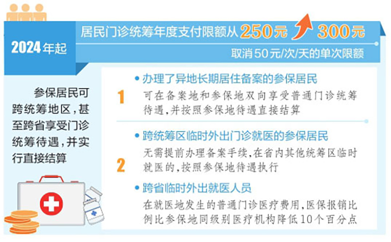 11月13日,记者从省医保局获悉,我省进一步完善城乡居民基本医疗保险普通门诊统筹政策,从2024年起,居民门诊统筹年度支付限额从250元提高至300元,参保居民可跨统筹地区,甚至跨省享受门诊统筹待遇,并实行直接结算。省医保局日前会同省财政厅、省卫健委联合印发《关于进一步完善城乡居民基本医疗保险普通门诊统筹政策的通知》(以下简称《通知》),明确相关政策。