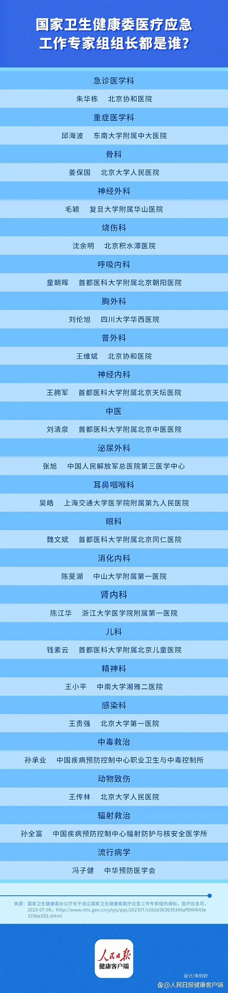 7月6日,国家卫健委发布医疗应急工作专家组名单,包括急诊医学科、重症医学科等22个学科的528位专家。这22个学科的专家组组长都是谁?