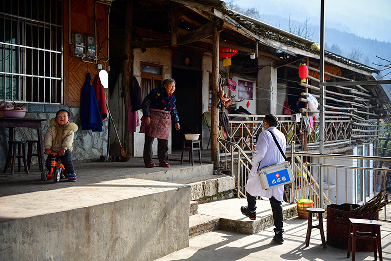 ▲1月19日,在北川县曲山镇石椅村,村医赵太安入户走访重点人群。新华社记者 张超群 摄
