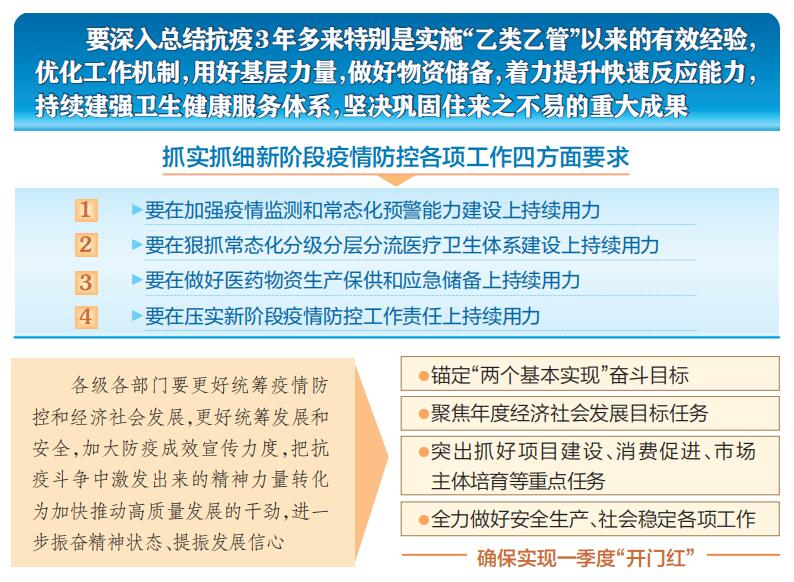 金湘军传达了全国疫情防控工作电视电话会议精神,指出,各级各部门要切实把思想和行动统一到党中央、国务院决策部署上来,按照省委工作要求,认真总结抗疫经验做法,完善相关机制举措,扎实做好“乙类乙管”常态化防控阶段各项工作。要健全疫情监测预警机制,加强应急医疗物资储备,做好重点人群疫情防控,完善卫生健康服务体系,深入推进中医药传承创新,切实增进人民群众健康福祉。要更好统筹疫情防控和经济社会发展、统筹发展和安全,聚焦年度目标任务,持续兴起项目建设热潮,大力招商引资、招才引智,推进市场主体倍增,促进消费恢复升级,全力推动一季度实现“开门红”,同步做好信访维稳及各行业领域安全隐患排查整治工作,确保全省社会大局和谐稳定。