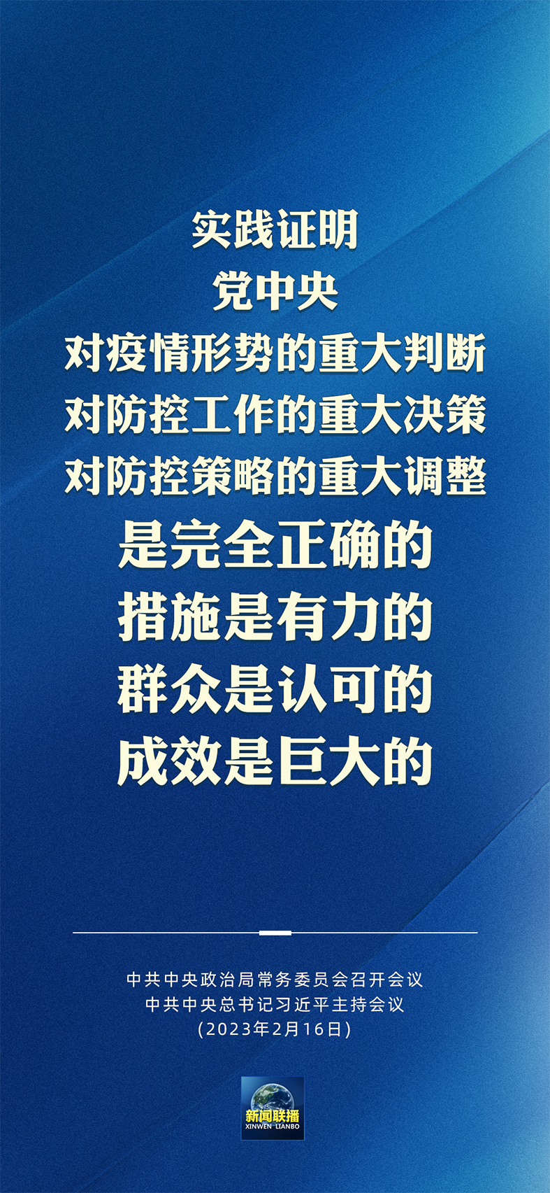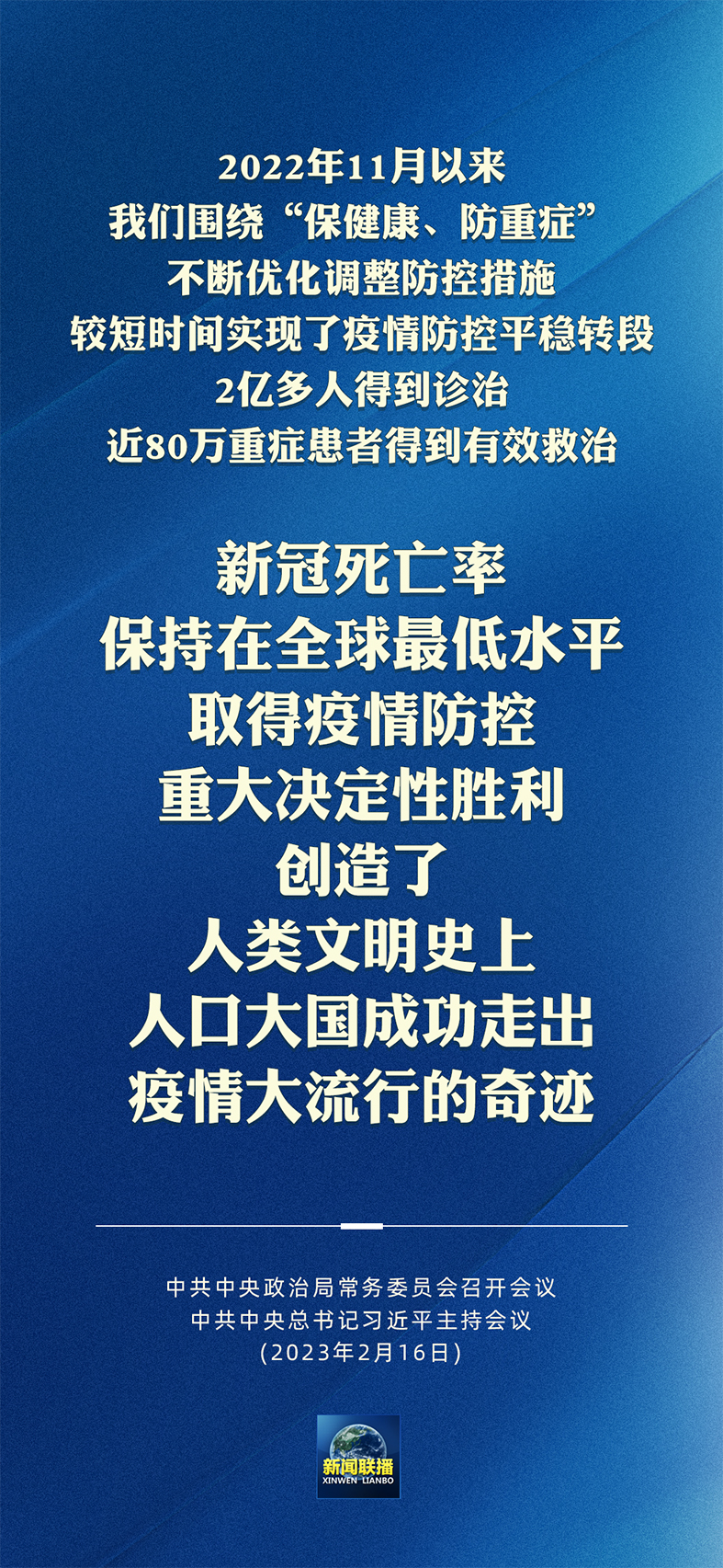 会议指出,3年多来,我国抗疫防疫历程极不平凡。以习近平同志为核心的党中央始终坚持人民至上、生命至上,团结带领全党全国各族人民同心抗疫,以强烈的历史担当和强大的战略定力,因时因势优化调整防控政策措施,高效统筹疫情防控和经济社会发展,成功避免了致病力较强、致死率较高的病毒株的广泛流行,有效保护了人民群众生命安全和身体健康,为打赢疫情防控阻击战赢得了宝贵时间。2022年11月以来,我们围绕“保健康、防重症”,不断优化调整防控措施,较短时间实现了疫情防控平稳转段,2亿多人得到诊治,近80万重症患者得到有效救治,新冠死亡率保持在全球最低水平,取得疫情防控重大决定性胜利,创造了人类文明史上人口大国成功走出疫情大流行的奇迹。实践证明,党中央对疫情形势的重大判断、对防控工作的重大决策、对防控策略的重大调整是完全正确的,措施是有力的,群众是认可的,成效是巨大的。