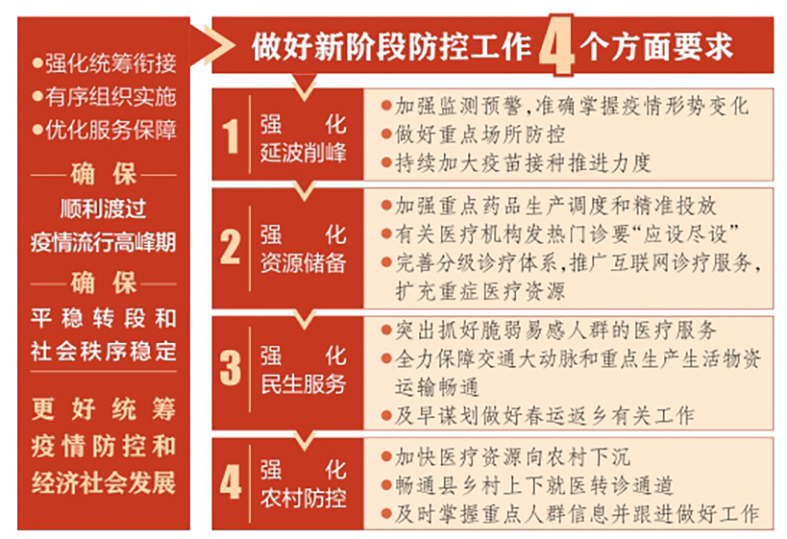 林武对做好新阶段防控工作提出四个方面要求。一是强化延波削峰。要加强监测预警,准确掌握疫情形势变化,做好医院、学校、大型企业、养老和社会福利机构等重点场所防控,持续加大疫苗接种特别是老年人接种和加强免疫接种的推进力度,尽量推迟第一波感染高峰到来时间,努力压平感染曲线,确保平稳渡峰。二是强化资源储备。要加强重点药品生产调度和精准投放,保障居家群众、门诊和住院患者都有药可用。有关医疗机构发热门诊要“应设尽设”,多种形式设立临时发热诊室,更好满足群众问诊需求。完善分级诊疗体系,推广互联网诊疗服务,扩充重症医疗资源,确保重症患者应收尽收、及时得到救治。三是强化民生服务。要突出抓好老年人、儿童、孕产妇、有基础性疾病患者等脆弱易感人群的医疗服务,全力保障交通大动脉和重点生产生活物资运输畅通,及早谋划做好春运返乡有关工作,确保各方面基本公共服务不断档。四是强化农村防控。加快医疗资源向农村下沉,充分发挥县域内医疗机构作用,畅通县乡村上下就医转诊通道,用好村(社区)党组织和网格管理力量,及时掌握重点人群信息并跟进做好工作,确保各项工作举措在农村落地落细。