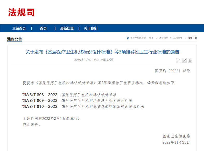 关于发布《基层医疗卫生机构标识设计标准》等3项推荐性卫生行业标准的通告