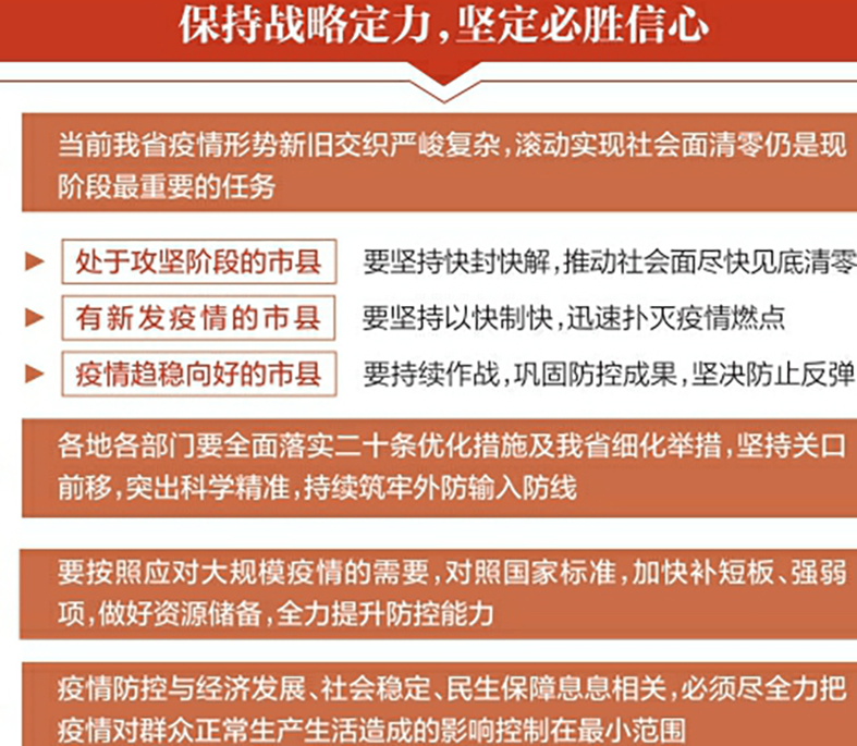林武指出,当前我省疫情形势新旧交织严峻复杂,滚动实现社会面清零仍是现阶段最重要的任务。处于攻坚阶段的市县要坚持快封快解,盯紧重点链条重点部位,同步推进核酸检测、流调排查、隔离转运等工作,推动社会面尽快见底清零。有新发疫情的市县要坚持以快制快,科学精准排查管控,迅速扑灭疫情燃点。疫情趋稳向好的市县要持续作战,巩固防控成果,坚决防止反弹,尽快彻底打赢疫情歼灭战。防控工作中,要强化市级统筹、提级指挥,完善高效协同运转的指挥体系,压紧压实“四方责任”,坚持“四应四尽”,抓好社区管控服务,确保各项防控措施落地见效。
