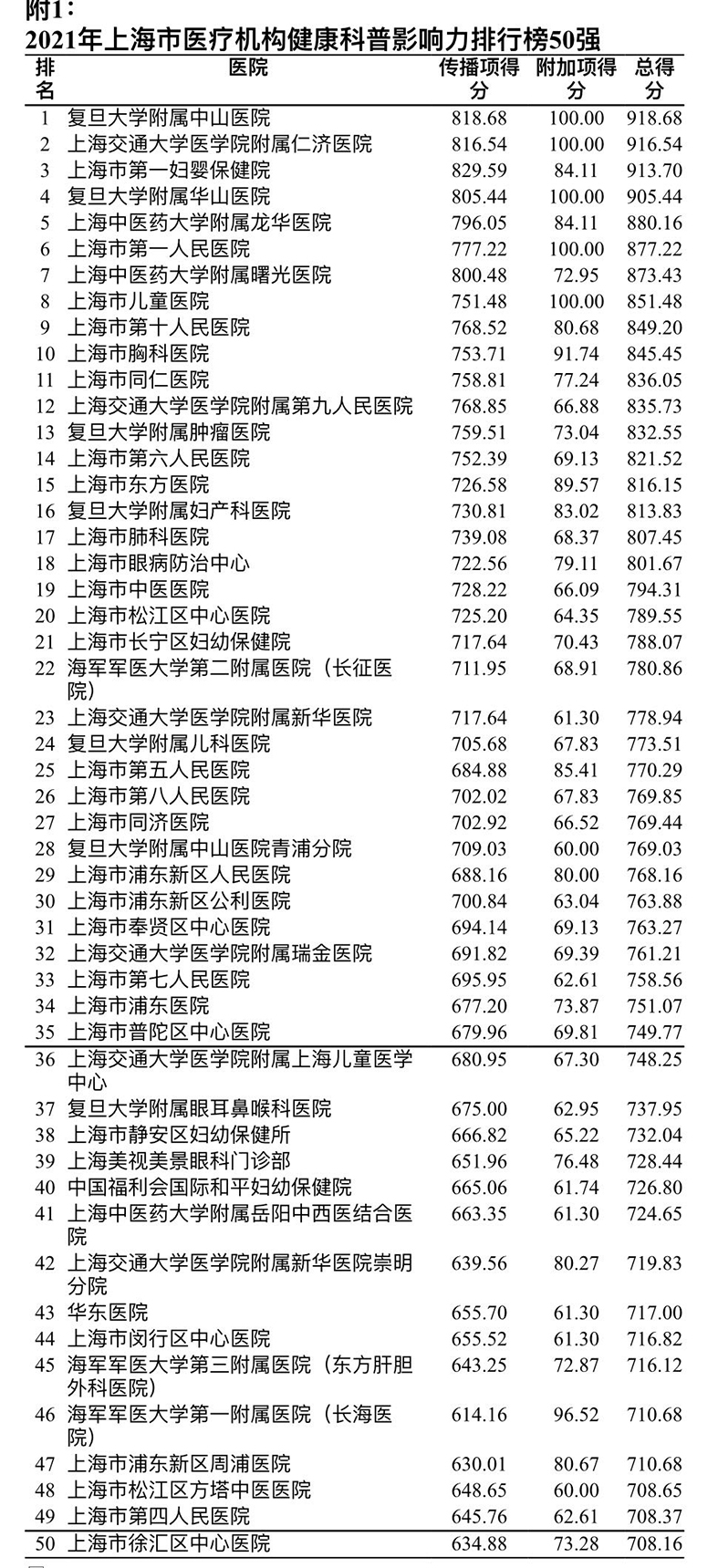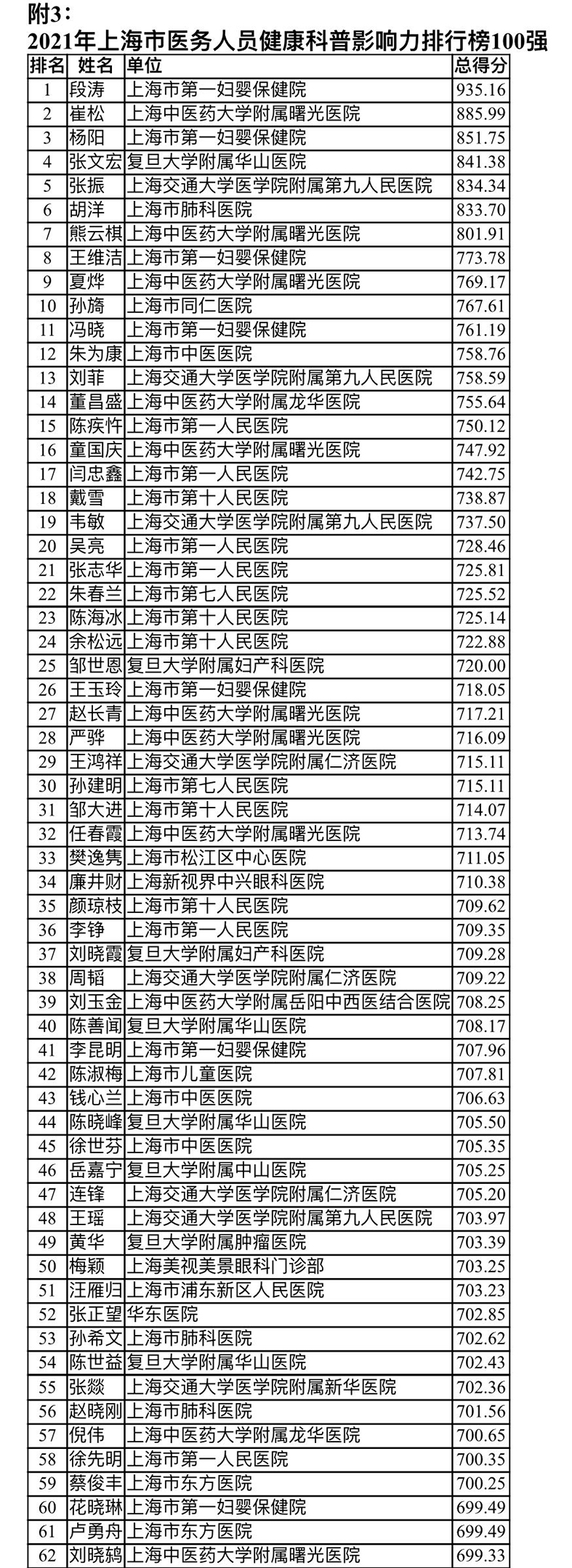 最终形成的医疗机构、社区卫生服务中心、医务人员健康科普影响力三个指数排行榜显示:复旦大学附属中山医院、上海交通大学医学院附属仁济医院、上海市第一妇婴保健院等入选医疗机构健康科普影响力指数排行榜50强;黄浦区打浦桥街道社区卫生服务中心、松江区泗泾镇社区卫生服务中心、奉贤区南桥镇社区卫生服务中心等入选社区卫生服务中心健康科普影响力指数排行榜50强;段涛、崔松、杨阳等入选医务人员健康科普影响力指数排行榜100强。