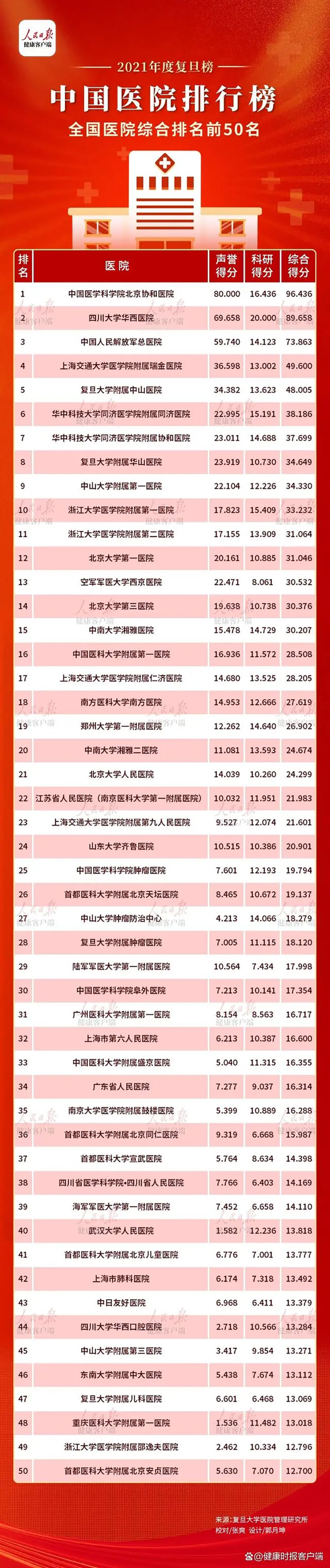 11月20日,复旦版《2021年度中国医院综合排行榜》和复旦版《2021年度中国医院专科声誉排行榜》在上海发布。中国医学科学院北京协和医院、四川大学华西医院、中国人民解放军总医院、上海交通大学医学院附属瑞金医院和复旦大学附属中山医院位列《2021年度中国医院综合排行榜》前五名。全国共有100家医院进入“复旦版中国医院综合排行榜”,42个专科(前10名)榜上有名。这是复旦大学医院管理研究所作为独立第三方开展的公益性项目,也是复旦版中国医院排行榜连续第十三年发布。