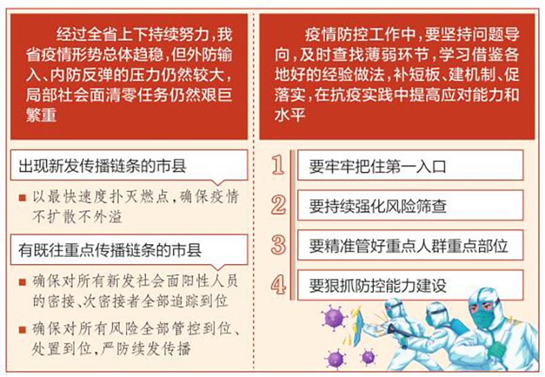 林武指出,疫情防控工作中,要坚持问题导向,及时查找薄弱环节,学习借鉴各地好的经验做法,补短板、建机制、促落实,在抗疫实践中提高应对能力和水平。一要牢牢把住第一入口。严格执行“第一时间、第一落点”管控等有效机制,按规定抓好道路卡口的设置、管理和服务,多种方式广泛宣传有关防疫政策要求,引导群众认真履行防疫责任。对以各种方式隐瞒行程、规避检查造成严重后果的,按照传染病防治法和国家有关规定严肃追究责任。二要持续强化风险筛查。严格落实社会面风险筛查有关规定,严格公共场所扫码验码要求落地的监督检查,严格执行有关全员核酸、加密核酸要求,有疫情的市县至少要做到3天1轮,认真抓好农村地区、城乡结合部的核酸检测覆盖,切实提高风险早发现的能力。三要精准管好重点人群重点部位。校园防控要切实抓好校门管理、师生健康监测、人文关怀等工作,确保封闭管理的学校做到真封闭、真闭环,筑牢校园防线。要有力有效抓好风险地区外来重点人员风险防控,实施好“白名单”制度、货车专用服务场地、核酸加急采检等行之有效的办法,最大限度降低输入风险。四要狠抓防控能力建设。立足防大疫、打大仗准备,下决心、下功夫加强防控能力建设,深入评估核酸检测、隔离房间、方舱医院、流调队伍等关键资源力量,多措并举提标提效,确保一旦遇到较大规模疫情,各项能力跟得上疫情发展和应急处置需要。