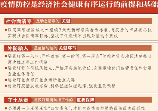 林武指出,疫情防控是经济社会健康有序运行的前提和基础。只有保持疫情形势平稳向好,才能集中精力做好稳经济、保安全各项工作。如果疫情得不到有效控制,经济社会发展和群众正常生产生活都会遭受冲击。面对传播风险加大、传播速度加快的新冠病毒挑战,抓好疫情应急处置和常态化防控工作,必须坚决克服麻痹思想、松劲心态,认真总结经验教训,深刻分析差距短板,在防疫一线提升能力本领。林武强调,社会面清零是动态清零的关键,以隔离管控区域之外连续3天无新增感染者为标准,有疫情的市县要尽快实现社会面清零目标,坚决守住疫情不出现外溢这个底线。要坚持以快制快、科学精准,第一时间理清传播链条、排查风险人员、管住重点区域,关键时刻要果断果敢处置、精准有效出手,坚决防止因处置不及时导致疫情由小变大,坚决防止因管控不到位导致疫情不断拖尾。要按照国家卫健委有关专家组指导意见,进一步优化混采核酸检测服务,提升检测效率和精准度,提高疫情风险“早发现”能力。各地都要对手上防控资源进行再评估再加强,进一步做好隔离酒店、定点医院和方舱医院等方面的储备与建设,提高防控能力水平,为做好疫情防控工作提供有力支撑。