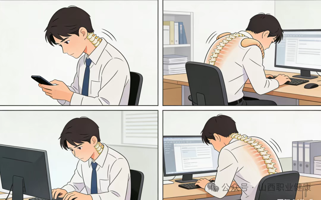 办公设备不适:办公椅没有颈枕支撑,或者电脑屏幕高度过低,人们不得不低头迁就,从而形成恶性循环。